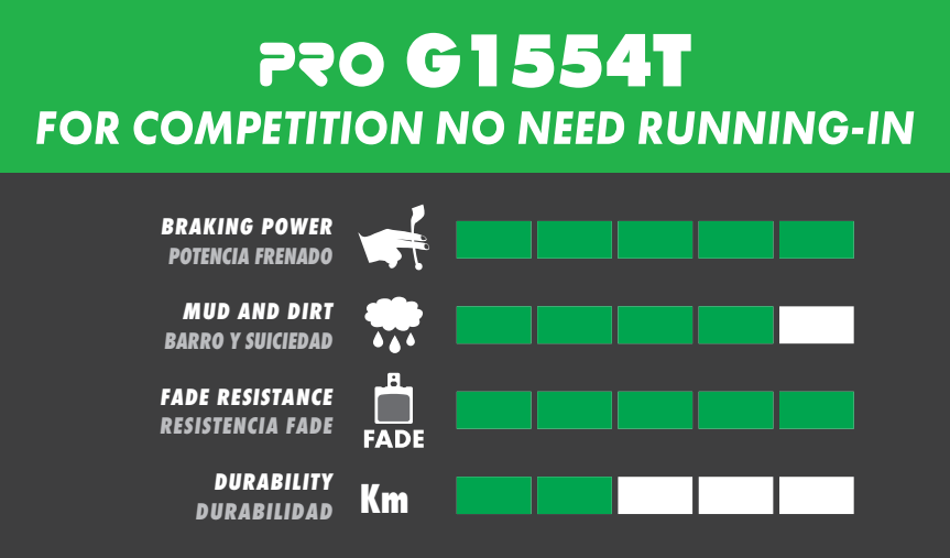 De gröna Pro bromsklossarna är Galfers högkvalitativa modeller. De trivs på racebanan och fortsätter där andra klossar redan har gett upp. Maximal bromskraft och precisa bromsmanövrar under alla förhållanden.