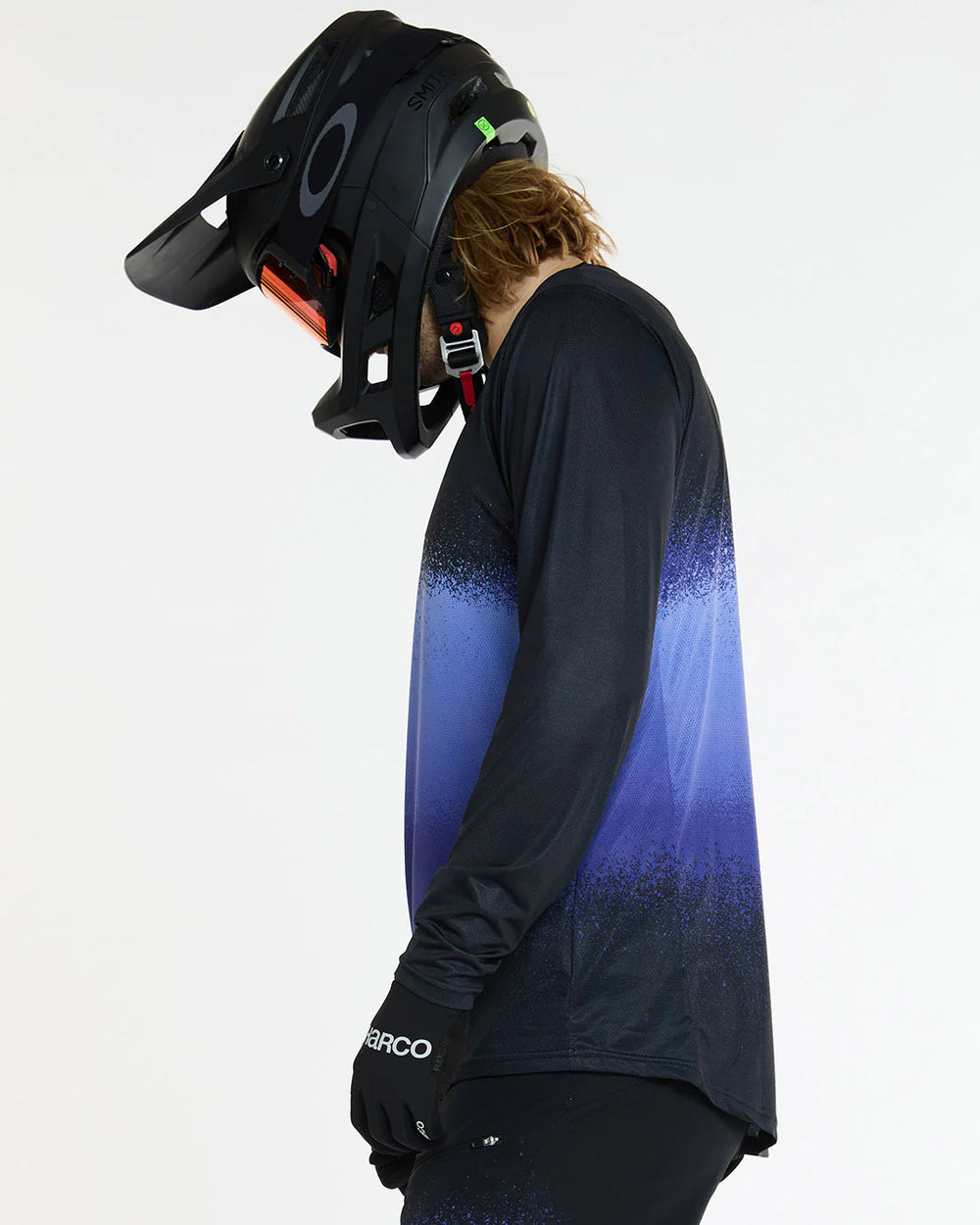 Cool, självsäker och byggd för att prestera – denna tröja har djärva lila sprayfärgseffekter för cyklister som vill lämna sitt avtryck. Lätt, snabbtorkande och med en slimmad passform på proffsnivå är den designad för att hålla dig bekväm samtidigt som du sticker ut på stigen.