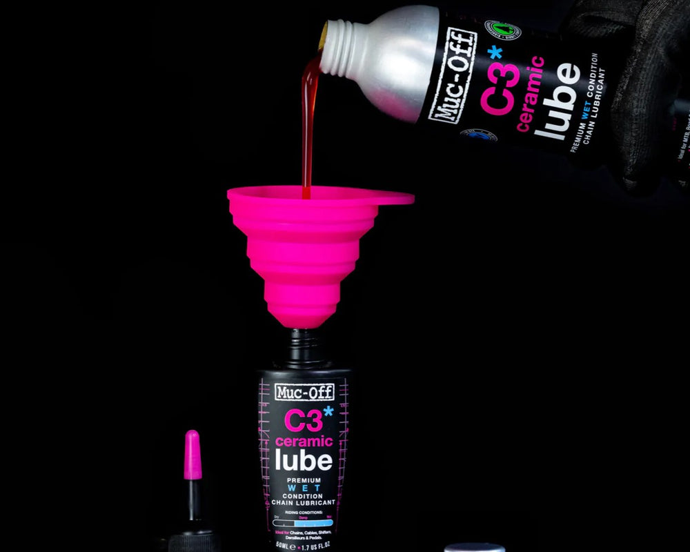 Muc-Off's collapsible silicone funnel is ultra-portable and made from silicone, which is plastic-free, food-grade safe and project Green certified.